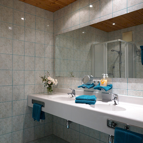 - 1 bathroom with double sink and shower